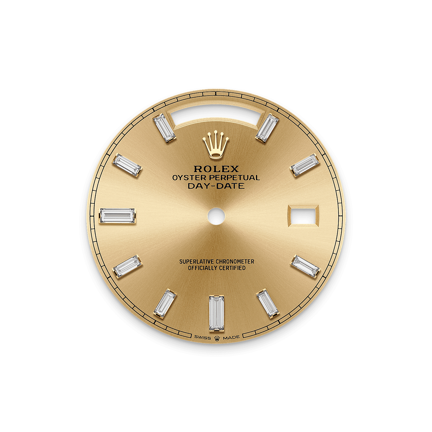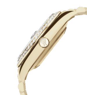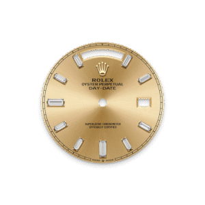تتميز ساعة أويستر بربتشوال داي ديت ٤٠ المصنوعة من ذهب أصفر عيار ١٨ قيراطًا بمينا بلون الشامبين مُرصّع بالألماس وبإطار مُرصّع بالألماس وبسوار بريزيدانت (President).