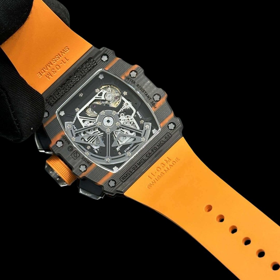 RM 11-03 Carbon Fiber Series – A perfect embodiment of ergonomic design, aligning with the brand’s pursuit of excellence and its iconic architectural philosophy. Every component of the RM 011 serves as an aesthetic expression of its functionality. Powered by a 7750 chronograph mechanical movement, it features clearly marked functional typography.