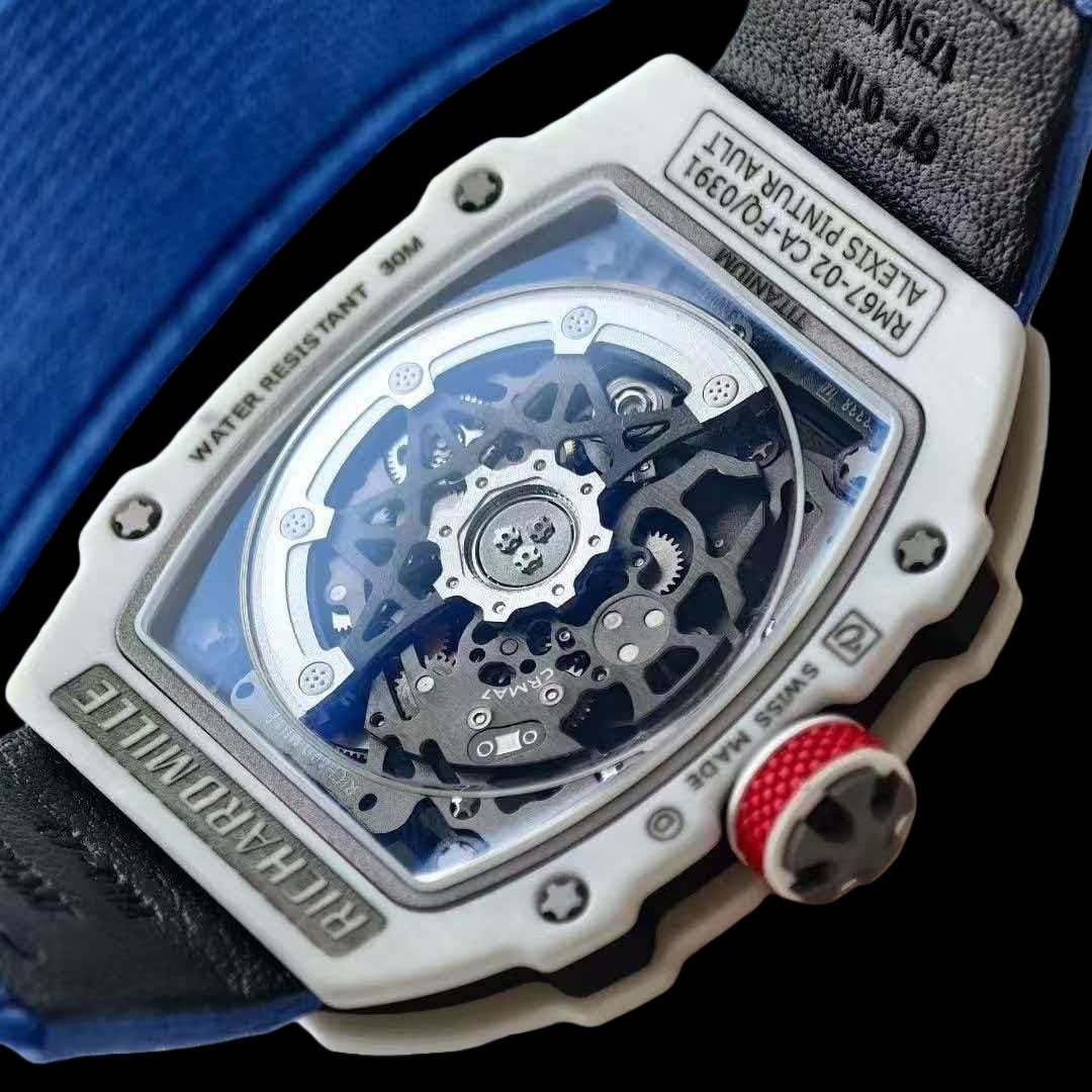 لا يتعدى الوزن الإجمالي لـ RM 67-02 اثنين وثلاثين جراماً (32 جراماً)، وذلك بفضل المزيج المتقن بين مواد TPT® المركبة المتطورة، وتيتانيوم الفئة الخامسة، بالإضافة إلى أحزمة إيلاستينير الأكثر خفةً في تاريخ العلامة. تجمع RM 67-02 بين النحافة الفائقة، والوزن الخفيف، والألوان الزاهية، والأناقة الرياضية، مما يجعلها رفيقاً مثالياً في جميع المناسبات. لقد كسرت ريتشارد ميل القوالب النمطية بتقديمها ساعة قابلة للتكيف مع متطلبات مختلف الرياضات. ومن هنا، قام بعض شركاء العلامة بتطوير نماذج خاصة تحمل ألوان دولهم، وذلك لاختبار أداء حركتها الآلية الذاتية التعبئة في ظروف متنوعة.